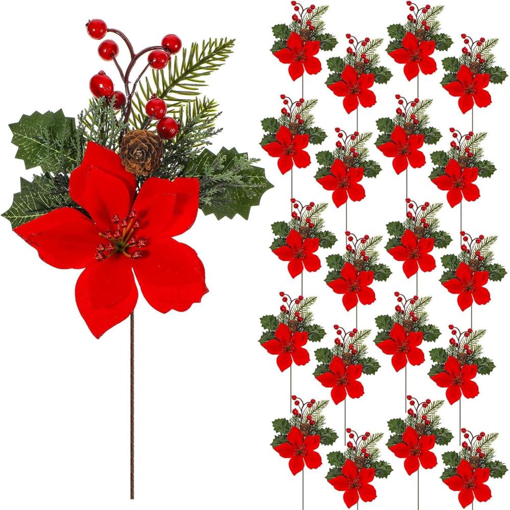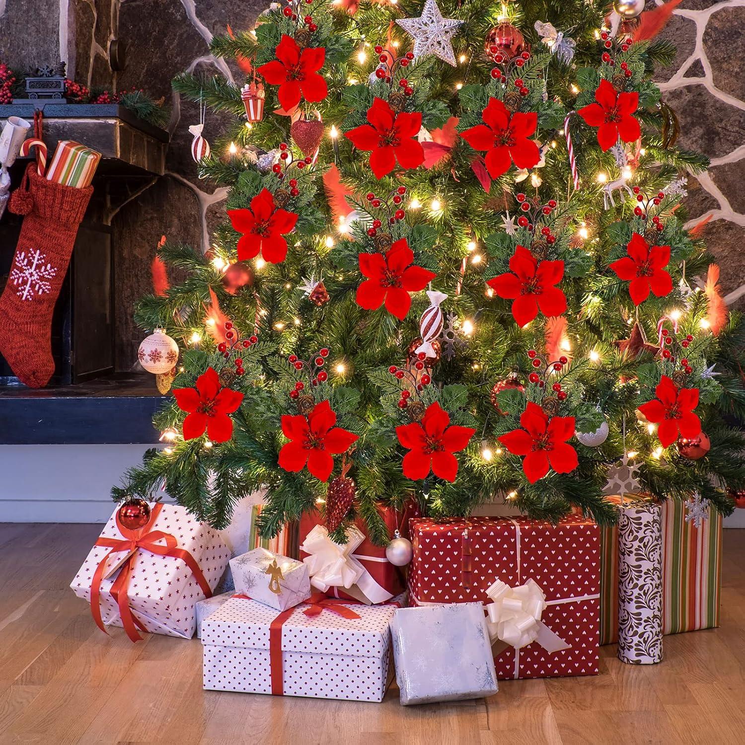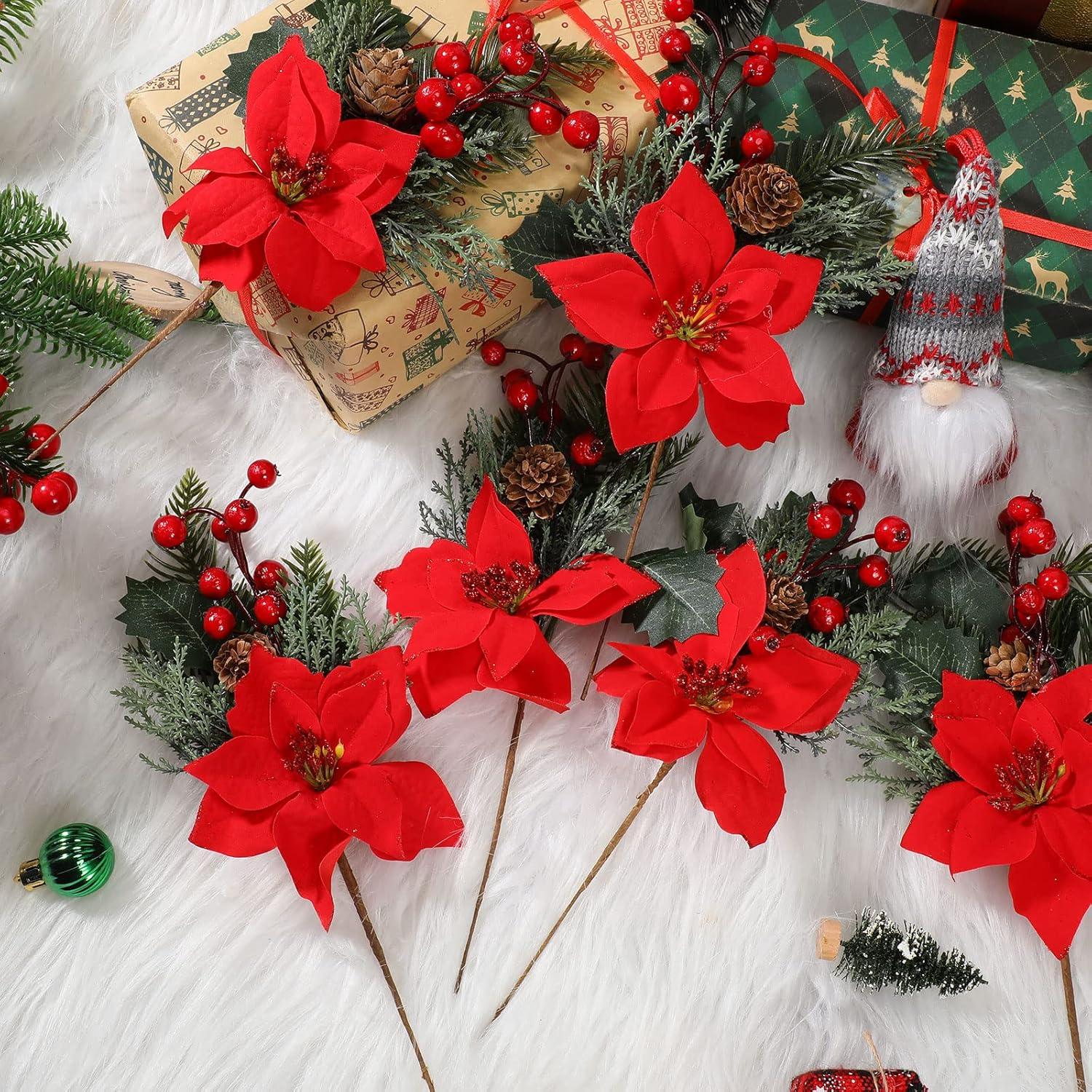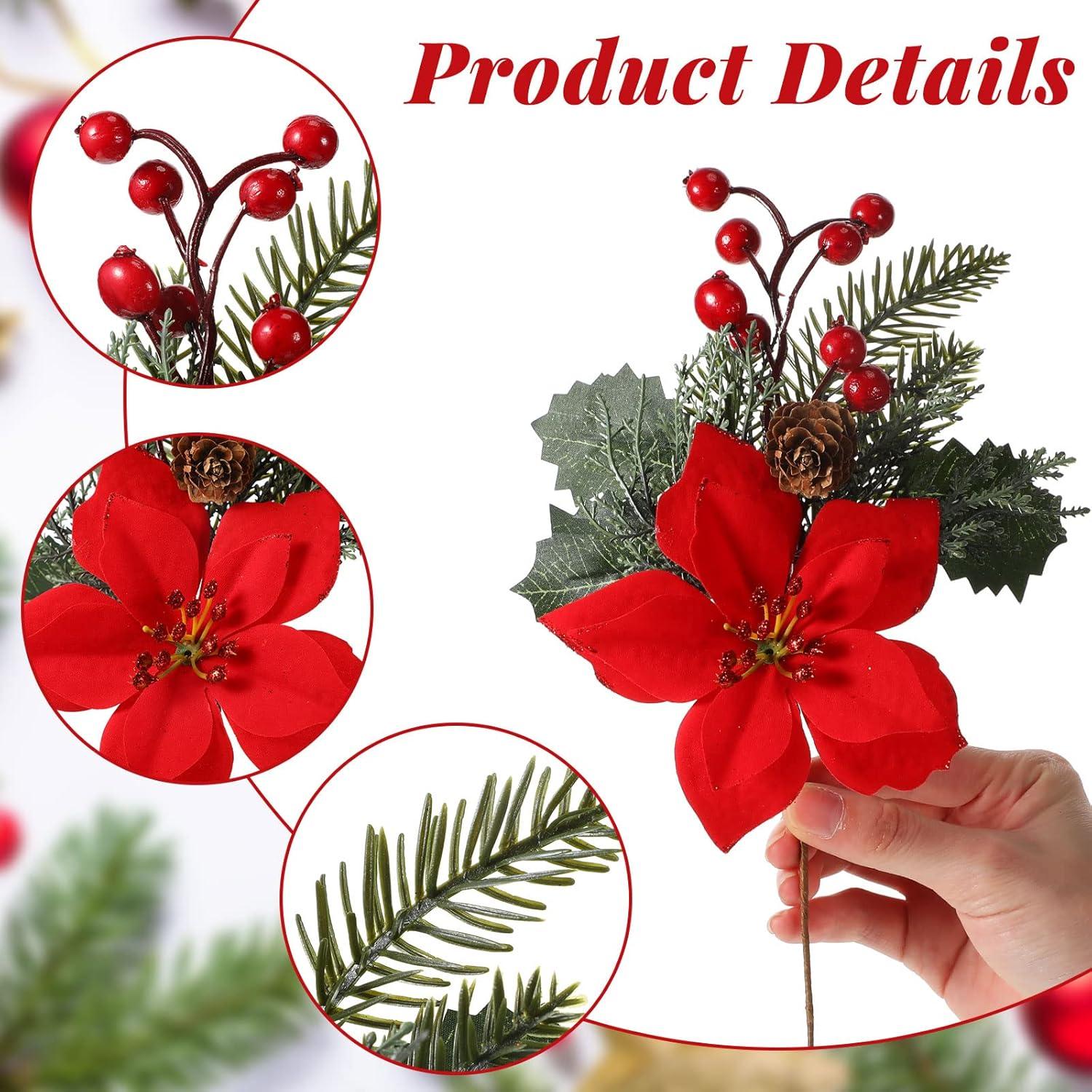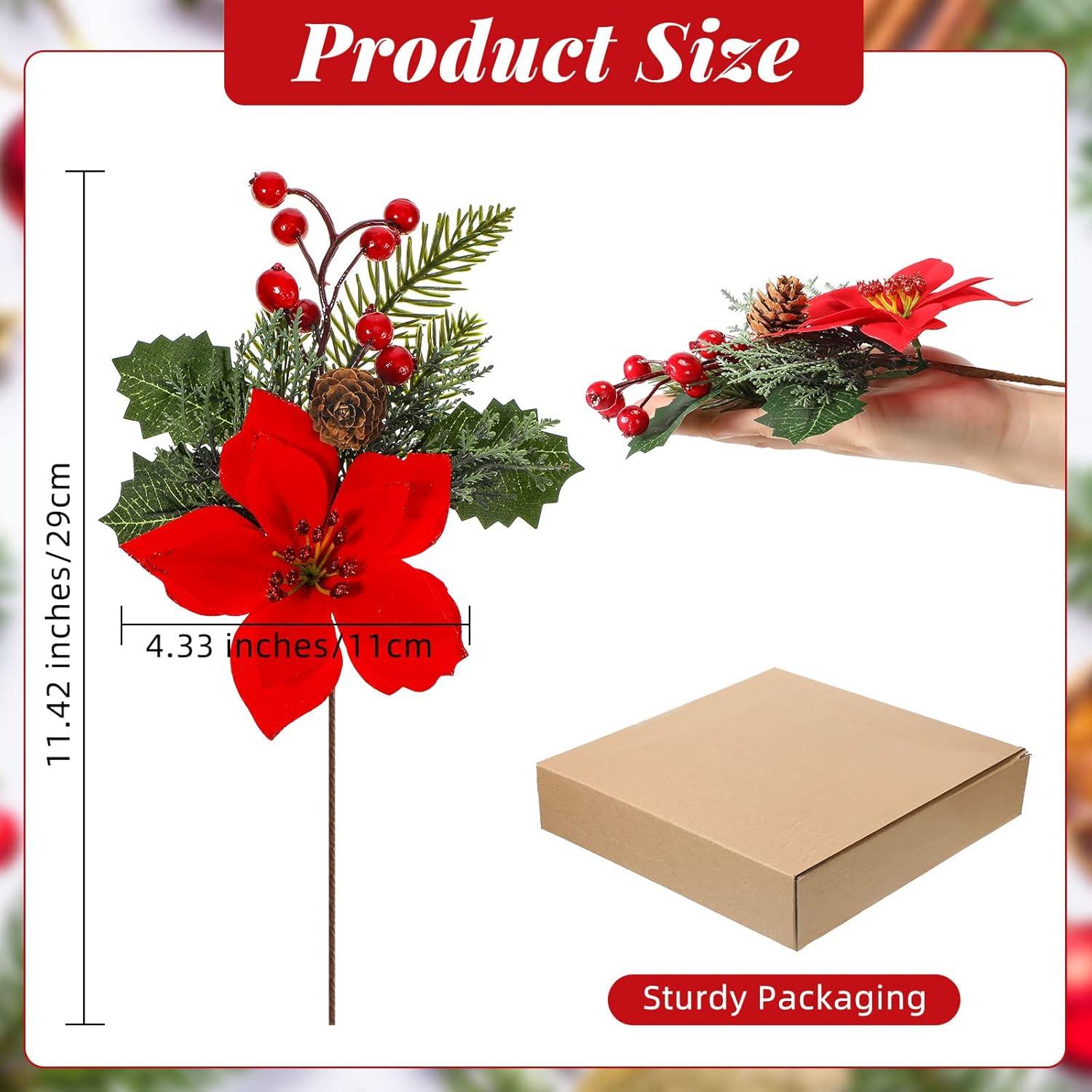 Classic Elements: being consists of poinsettia, red berries and pine cones, our Christmas glitter poinsettia flowers picks are the classic decoration for Christmas, glitter and exquisite, can accent your house with festival characters