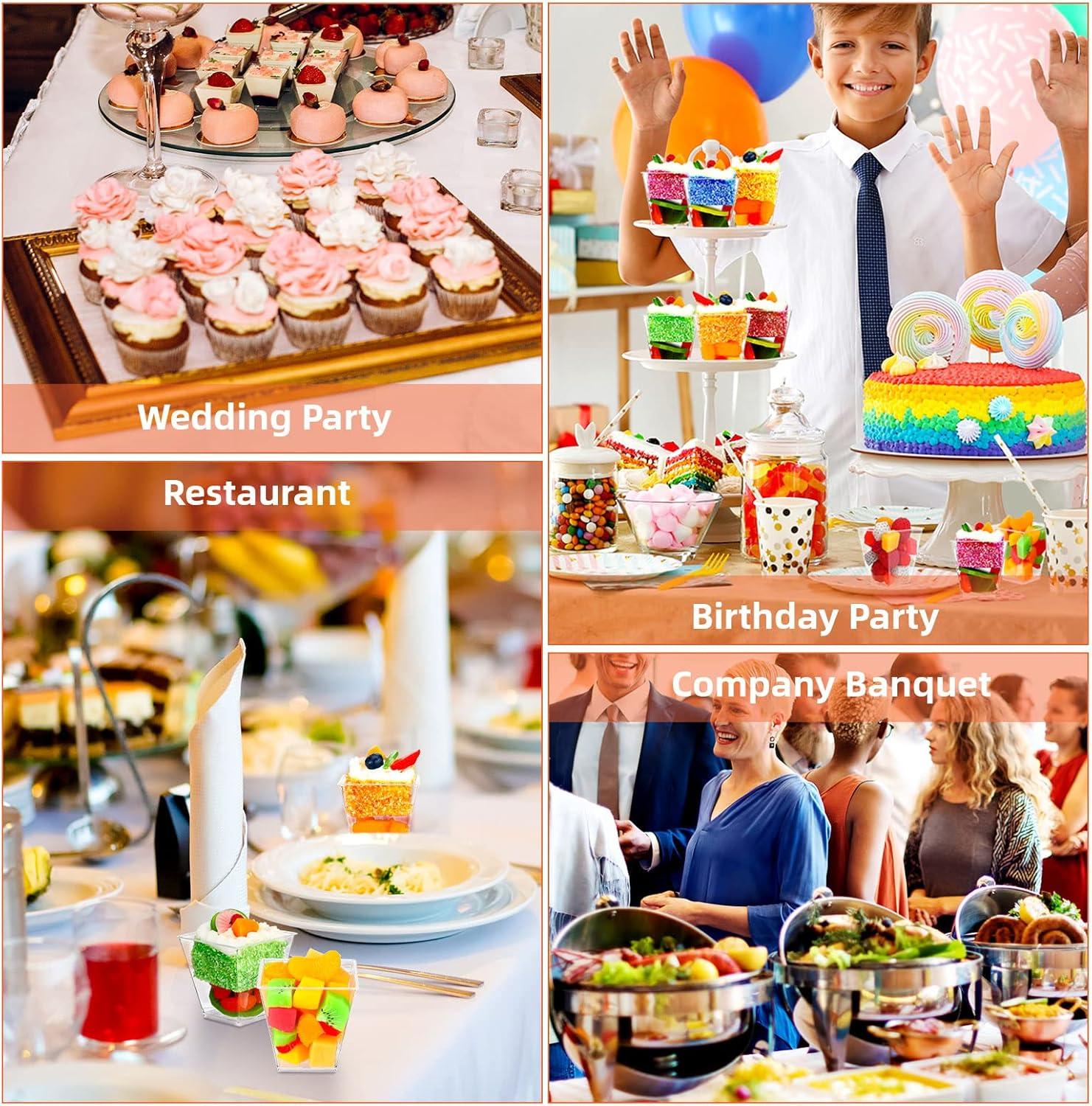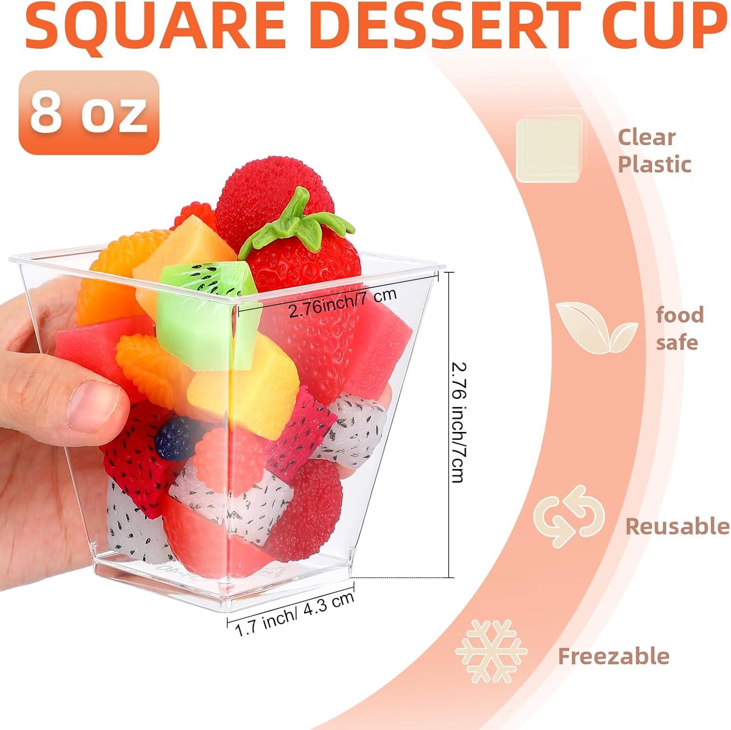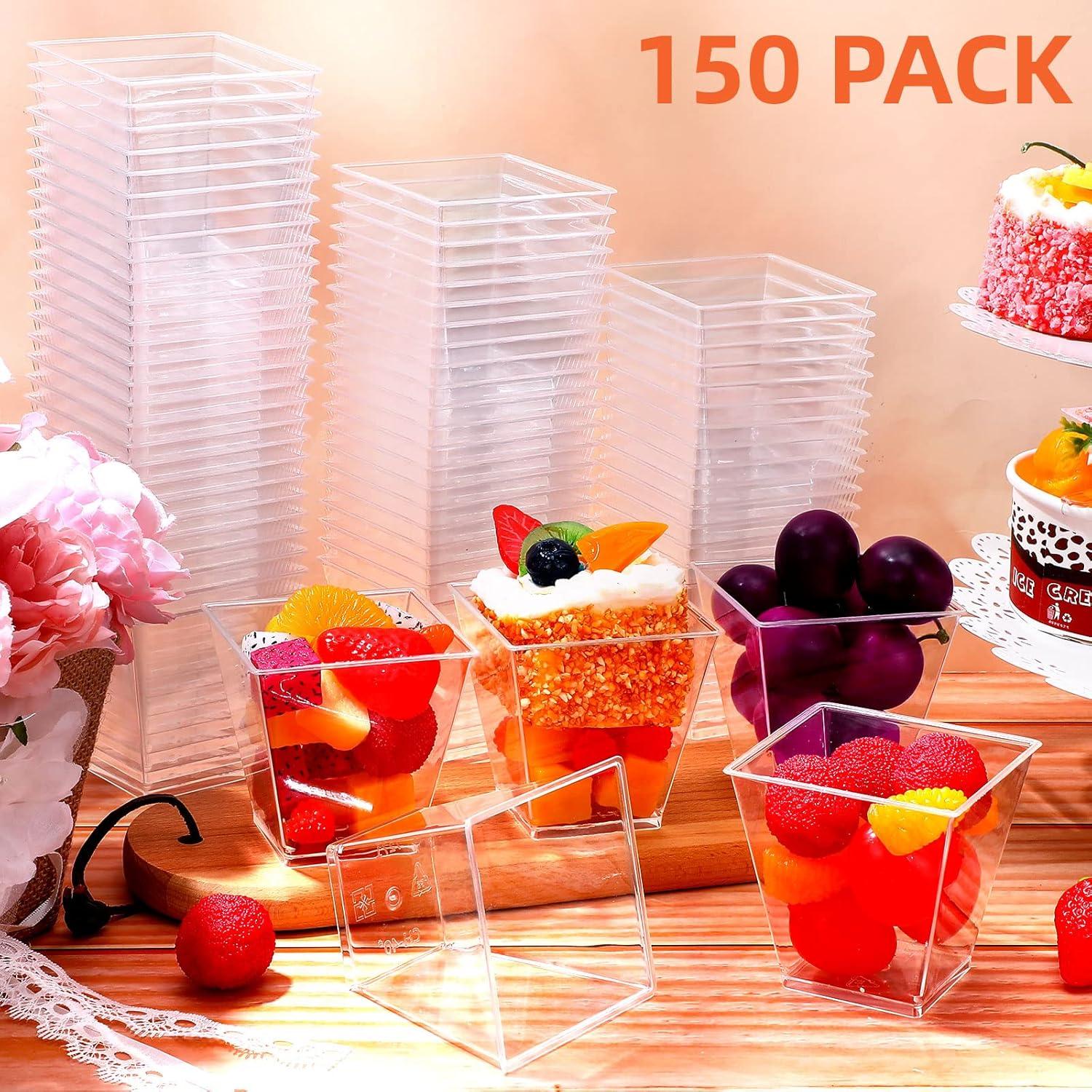 What You Get: this party package include 150 count 8oz dessert cups, treating your guests by easily adding a dash of simple yet elegant square dessert cup with lid to your party decorations