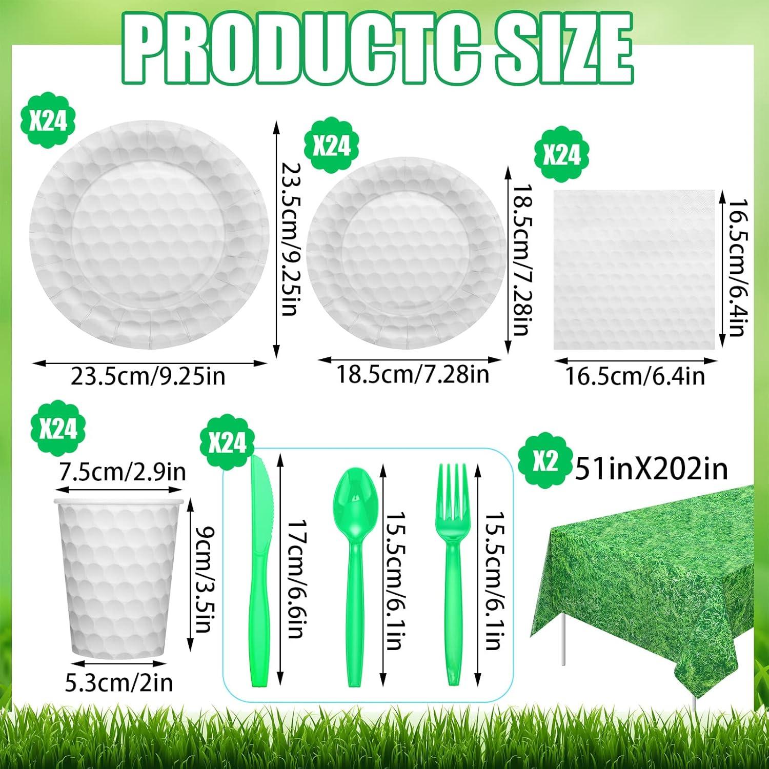 Serve for 24 Guests: there are 24 pieces of 9 inch golf plates, 24 pieces of 7 inch golf themed plates, 24 pieces of golf paper napkins, 24 pieces of paper cups, 2 pieces of golf plastic tablecloths, 24 pieces of spoons, 24 pieces of forks, 24 pieces of knives, 170 pieces in total, rich quantities and diverse styles can meet your serving needs