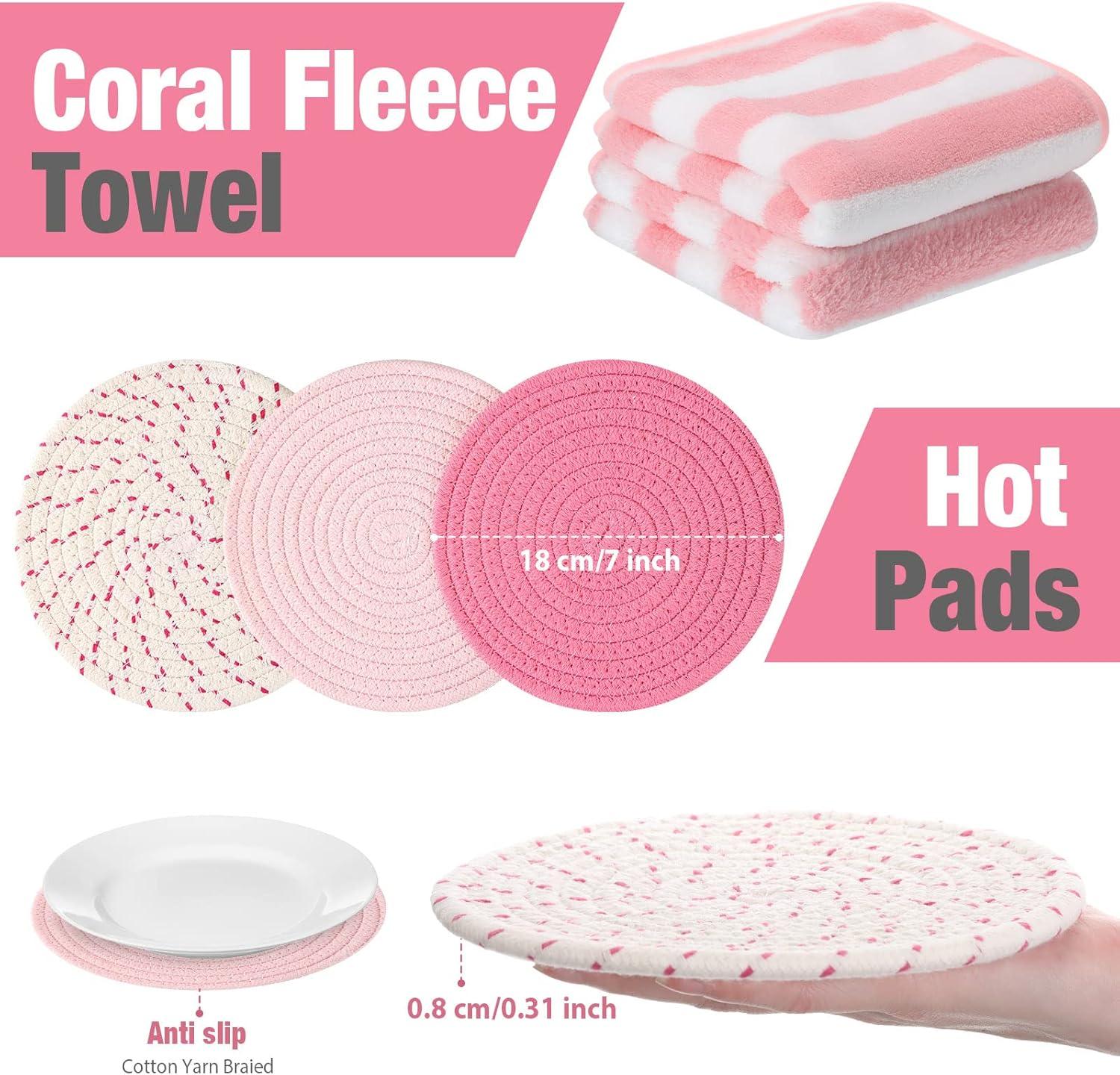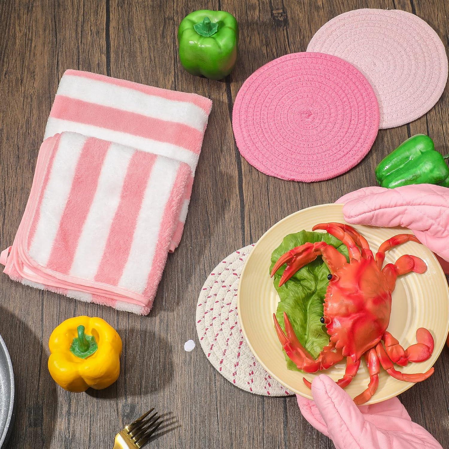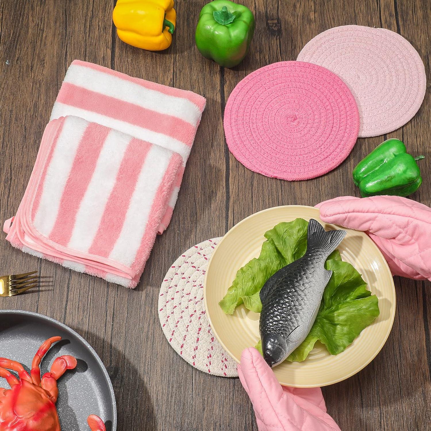 Safe and Reliable to Use: this oven mitt set is made of quality fabric material with exquisite workmanship, thickened and heat resistant, not easy to tear, wear or fade; Pot holders for kitchen heat resistant are made of quality cotton thread, with woven style and sweet colors, reusable and serviceable, can serve you for a long time; Dish towels are made of coral fleece material, soft and adsorbent, ideal for kitchen use